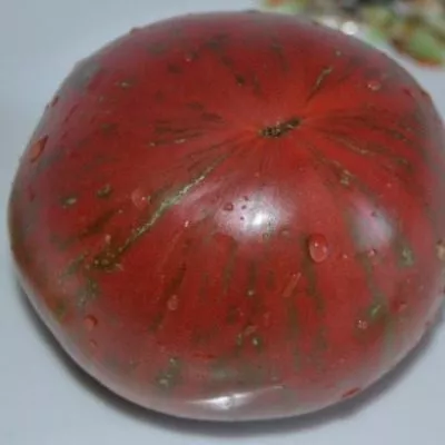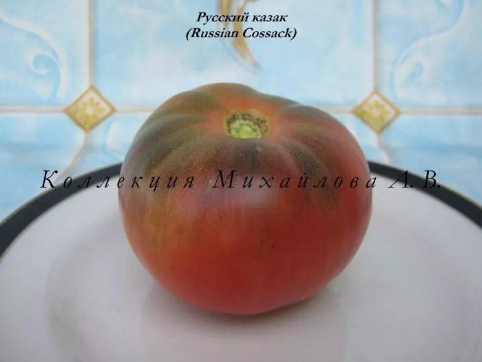 Полностью зрелый томат демонстрирует свой фирменный полосатый окрас. Важно понимать, что равномерного, однотонного окрашивания, как у классических розовых сортов, у Русского казака не происходит — пятнистость и полосатость являются его сортовой нормой.