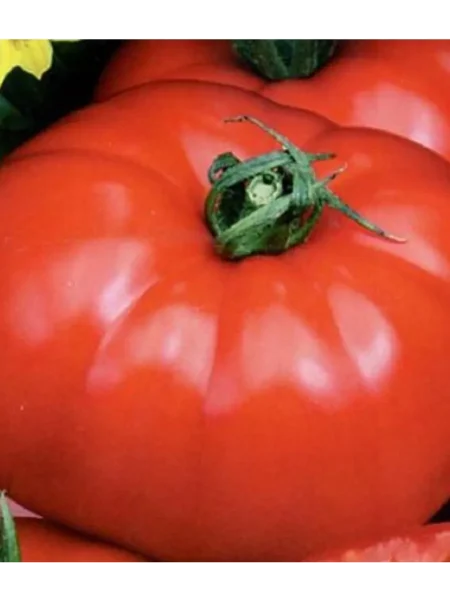 Плоды — главное достоинство сорта. Их форма классическая, плоскоокруглая, часто с заметной ребристостью в области плодоножки. В стадии технической спелости у плодоножки может присутствовать светло-зеленое пятно, которое полностью исчезает при полном созревании, сменяясь равномерным, насыщенным розово-малиновым цветом.