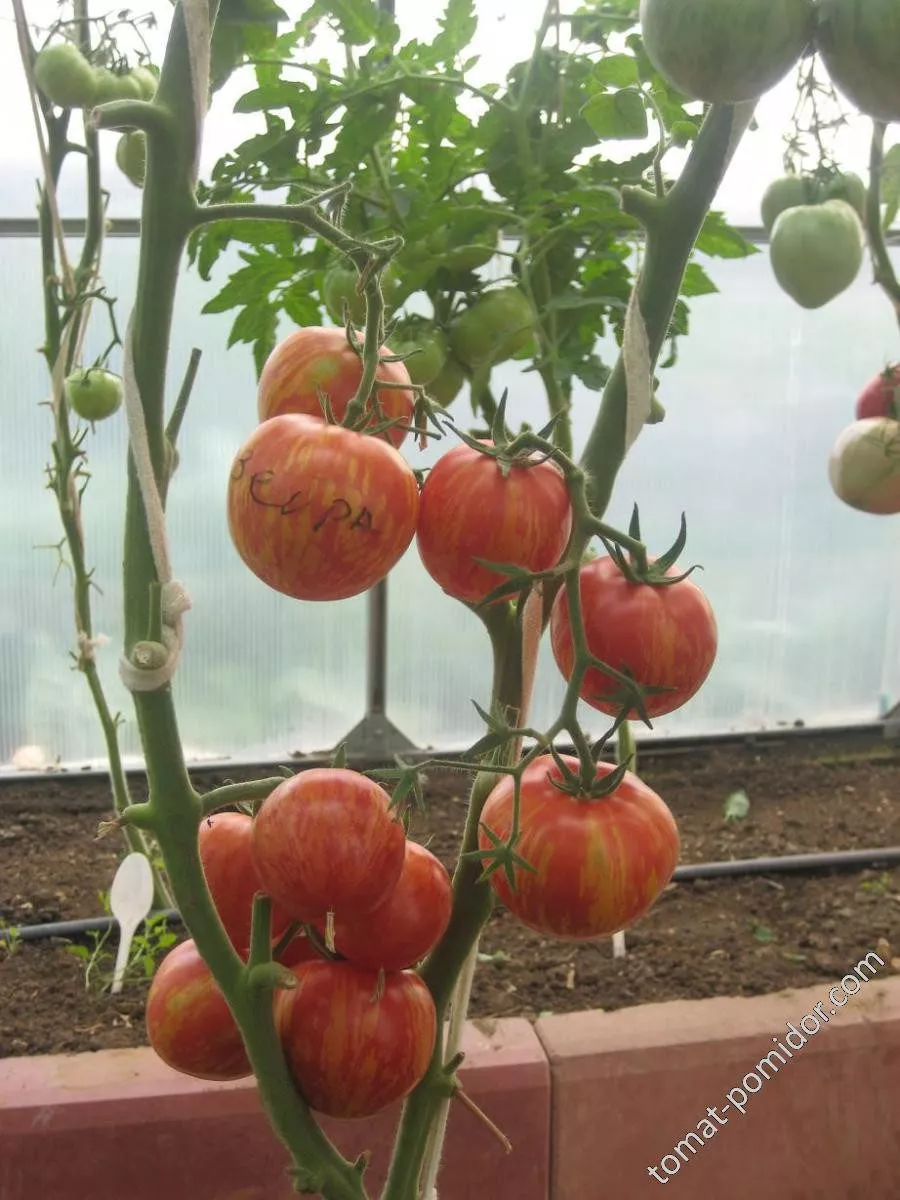 Название «Рябчик» было дано не случайно. Оно напрямую отсылает к характерному рисунку на кожице спелых плодов: красный основной фон расчерчен тонкими, прерывистыми желтыми полосками, что визуально напоминает рябую окраску перьев одноименной лесной птицы. Эта декоративность стала одной из ключевых причин его популярности, выделяя кусты на грядке или в теплице.