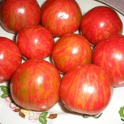 Основной цвет зрелого томата — классический насыщенный красный. Однако его украшает рисунок из тонких, прерывающихся желтых полосок. Чаще всего эти полосы расходятся от плодоножки, создавая эффектную «рябую» текстуру, которая и дала название сорту. Наибольшей контрастности и декоративности окраска достигает в период технической спелости, когда плод только начинает наливаться цветом.