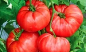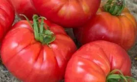 Плоды — ключевая отличительная черта сорта. Их форма плоскоокруглая, с выраженной, но средней по рельефу ребристостью в области плодоножки. В состоянии биологической зрелости помидоры приобретают равномерный насыщенно-красный окрас.