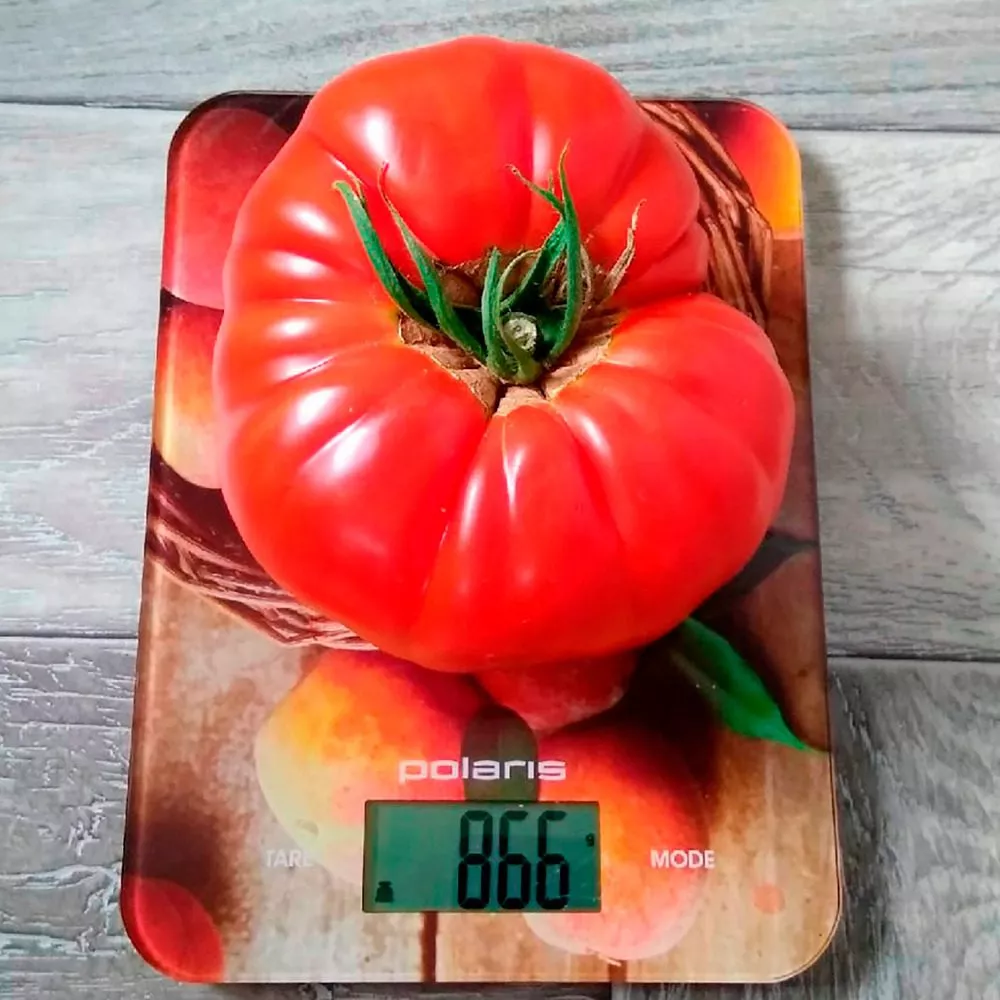 Размер плодов выдающийся: их масса составляет 450-650 граммов. На первых нижних кистях нередко завязываются томаты-гиганты массой более 700-800 граммов. Плодоножка имеет сочленение.