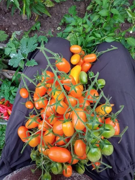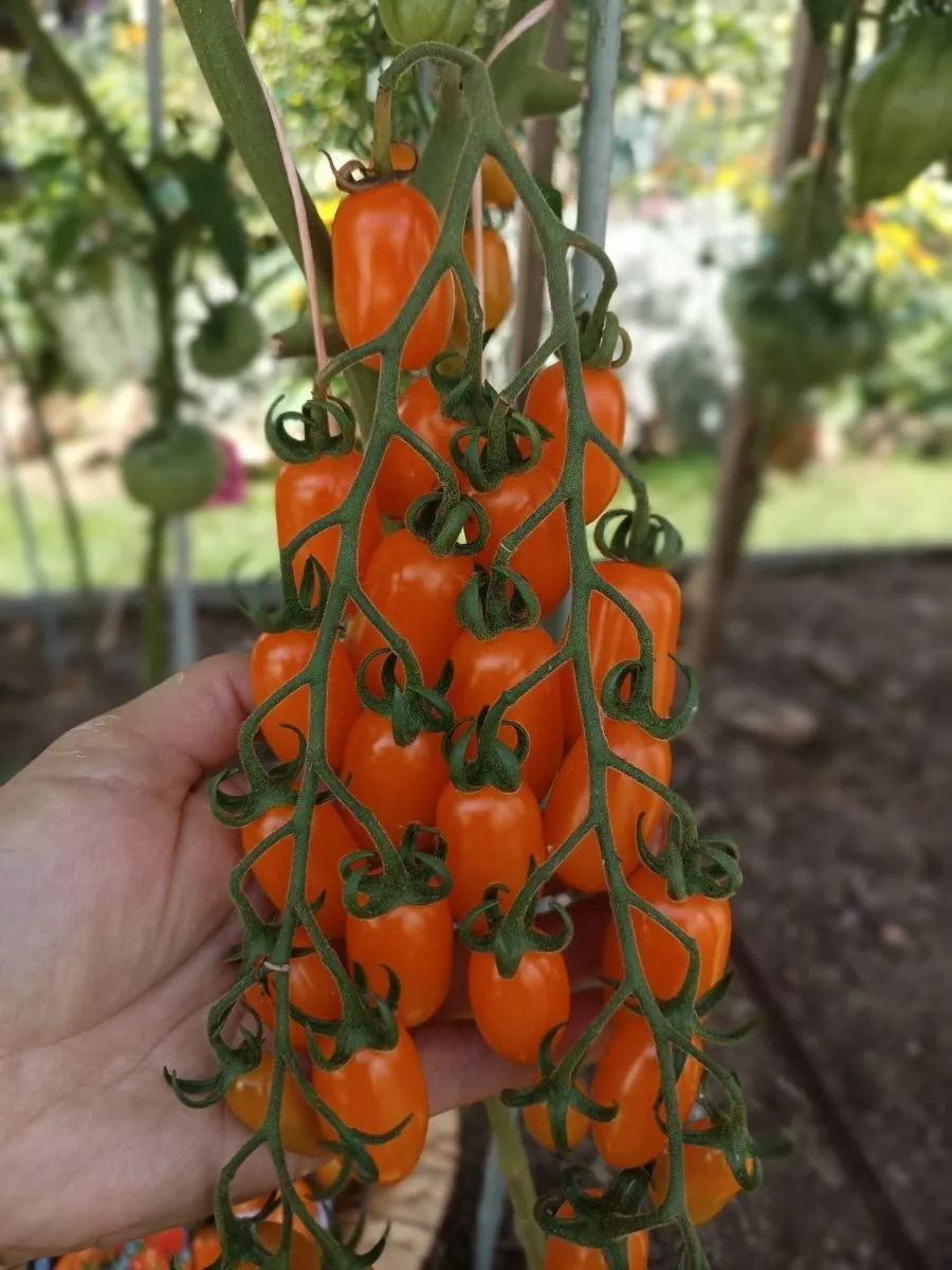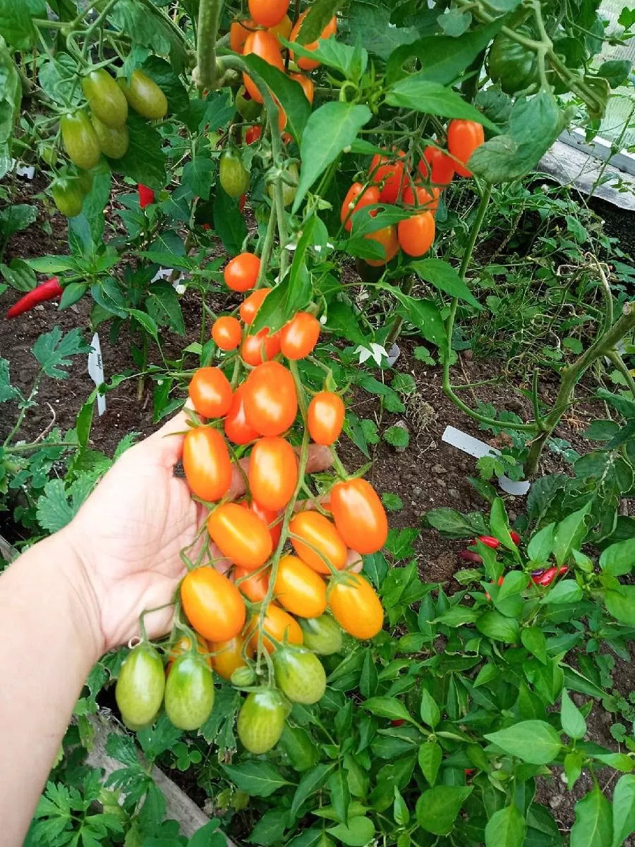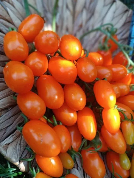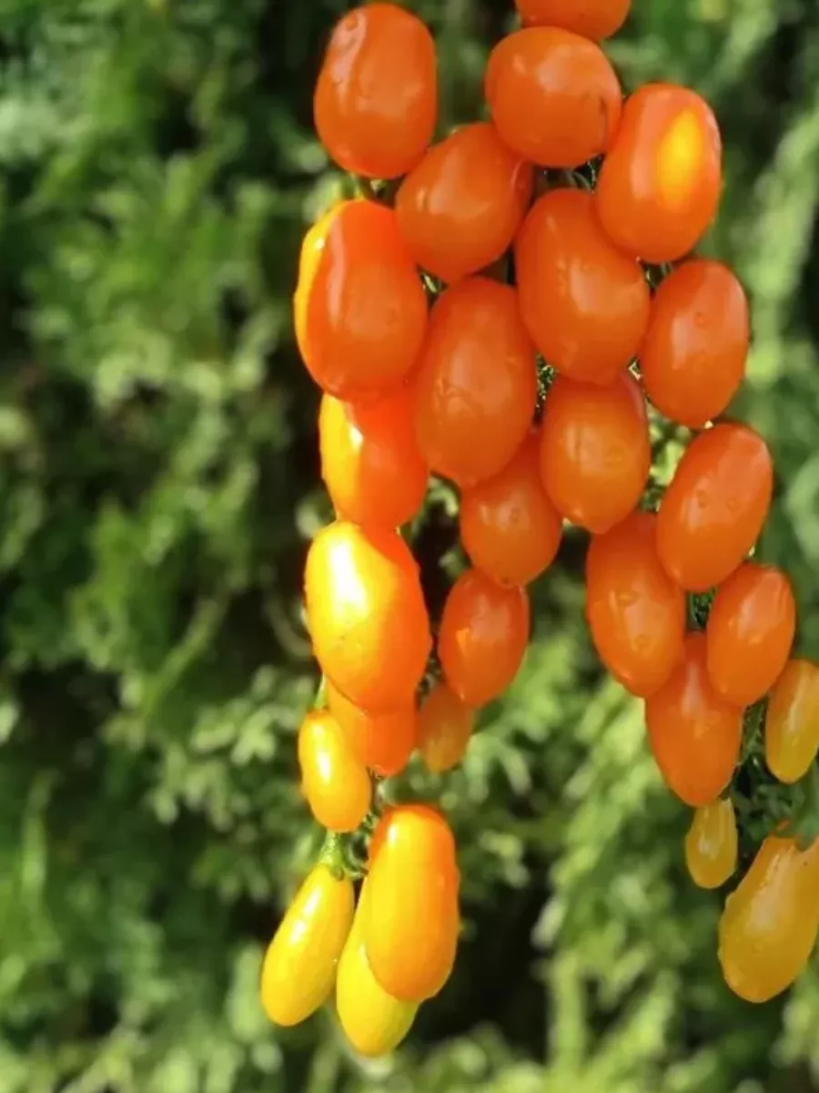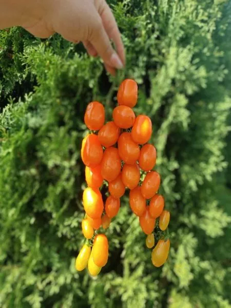 Плодовая кисть обычно сложная, с большим количеством завязей. Плоды некрупные, их масса соответствует заявленным 10-15 граммам. Их главная внешняя отличительная черта — форма. Вместо привычных округлых или сливовидных «черри» этот гибрид формирует аккуратные цилиндрические плоды, напоминающие крошечные бочонки или перчики.