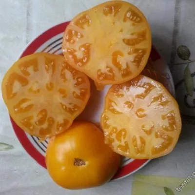 Главная «визитная карточка» сорта — это плоды. Их ярко-желтый цвет в полной зрелости равномерный, без зеленого или белесого пятна у плодоножки. Это говорит о высоком содержании каротиноидов и полном отсутствии хлорофилла в кожице, что является надежным визуальным признаком отличного вкуса.