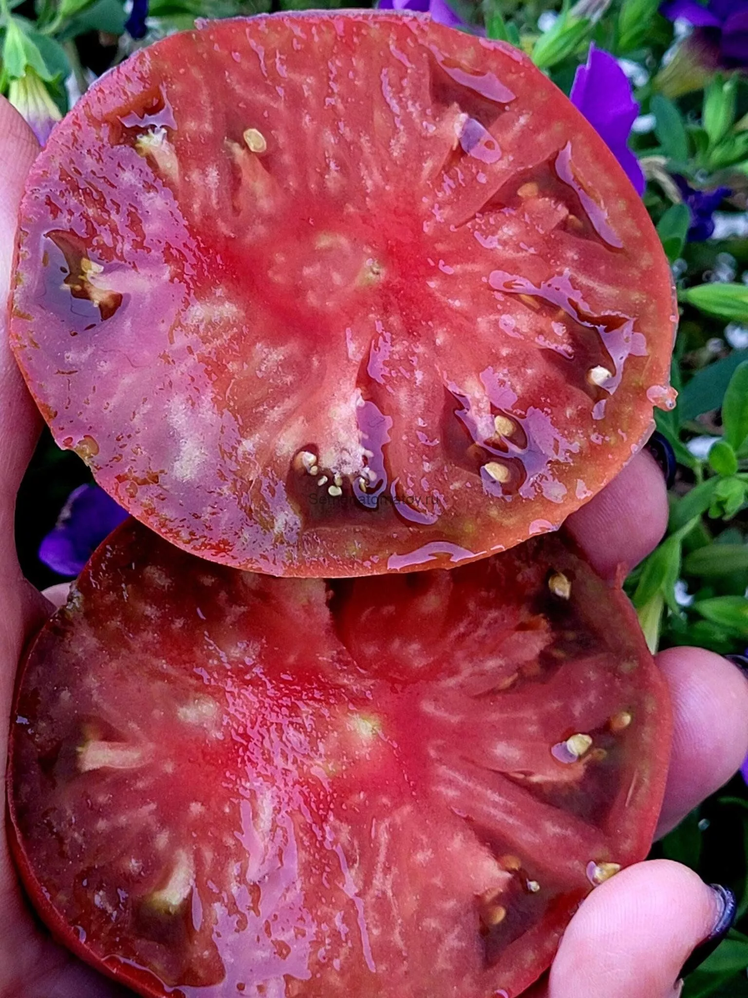 Этот внешний темный цвет контрастирует с внутренним содержимым. На разрез открывается мякоть интенсивного малиново-красного цвета, без зеленых или белых прожилок у семенных камер. Структура мякоти плотная, мясистая и сочная одновременно, что характерно для крупноплодных салатных сортов. Средний вес плода в 150-250 граммов подтверждает его статус крупного томата.
