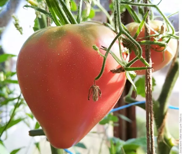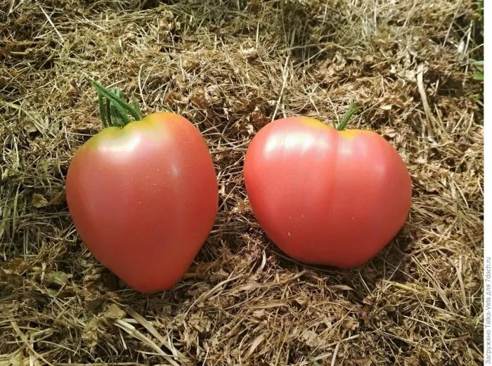 Главная отличительная черта этого сорта — его плоды, которые полностью оправдывают название. Их форма классифицируется как сердцевидная, часто с выраженным острым кончиком («носиком»), что является сортовым признаком. Полностью созревшие томаты имеют равномерный, насыщенный розовый цвет без зеленого пятна у плодоножки.