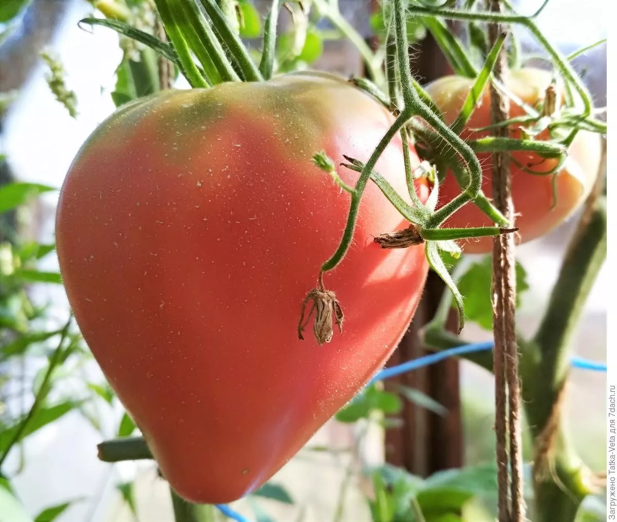 Высокорослость в сочетании с крупноплодностью делает обязательными два приема: подвязку и пасынкование. Подвязку к шпалере или прочным кольям начинают рано, когда рассада укоренится и тронется в рост, чтобы избежать полегания стебля под тяжестью будущего урожая.