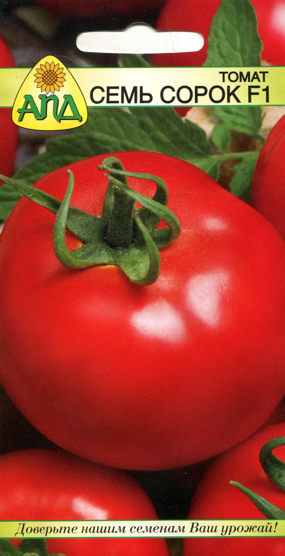 Томат Семь сорок является гибридом первого поколения, что обозначается маркировкой F1 на пакете с семенами. Это означает, что растения, выращенные из таких семян, будут обладать совокупностью лучших родительских признаков: выровненностью плодов, высокой урожайностью и устойчивостью к болезням. Однако собирать семена с этих томатов для посева на следующий год бесполезно — потомство не сохранит заявленных качеств.