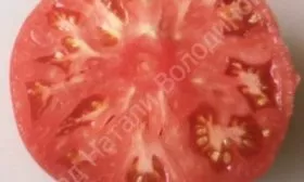 Мякоть исключительно плотная, мясистая и сахаристая. На изломе она не сочится соком, а напоминает по структуре спелый арбуз. Количество семенных камер небольшое, семян мало, что является типичным признаком современных крупноплодных биф-томатов. Именно такая мякоть с высоким содержанием сухих веществ и сахаров формирует знаменитый гармоничный и насыщенный вкус.