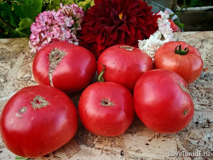Форма плодов классифицируется как плоскокруглая. Она особенно заметна, если разрезать томат поперек. У плодоножки часто наблюдается выраженная, но умеренная ребристость, которая не портит товарный вид, а скорее подчеркивает сортность. Полностью созревшие плоды окрашиваются в густой, теплый малиново-красный цвет без зеленого пятна у плодоножки.