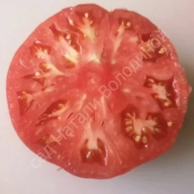 Мякоть исключительно плотная, мясистая и сахаристая. На изломе она не сочится соком, а напоминает по структуре спелый арбуз. Количество семенных камер небольшое, семян мало, что является типичным признаком современных крупноплодных биф-томатов. Именно такая мякоть с высоким содержанием сухих веществ и сахаров формирует знаменитый гармоничный и насыщенный вкус.