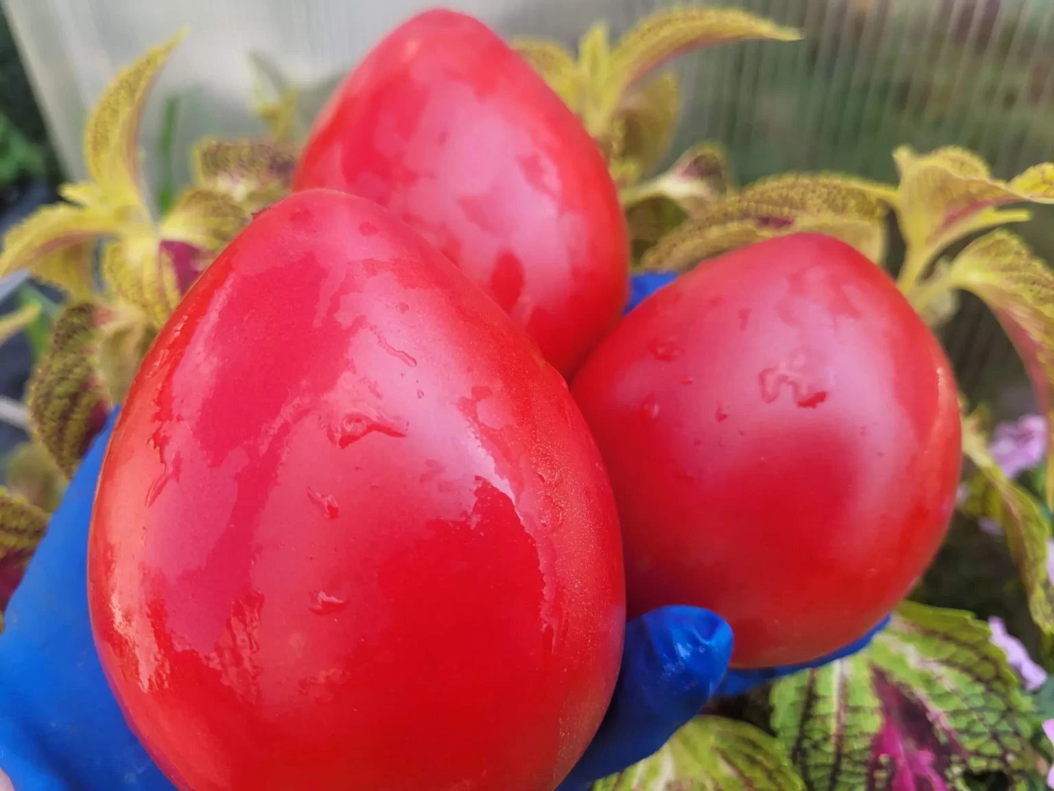 Окраска в биологической спелости — равномерная, насыщенно-красная, без зеленого пятна у плодоножки. Поверхность гладкая, с легким глянцевым блеском. Кожица, несмотря на кажущуюся тонкость, обладает хорошей плотностью и эластичностью. Это качество, в сочетании с умеренным поливом, защищает плоды от растрескивания, что особенно важно для крупноплодных томатов.