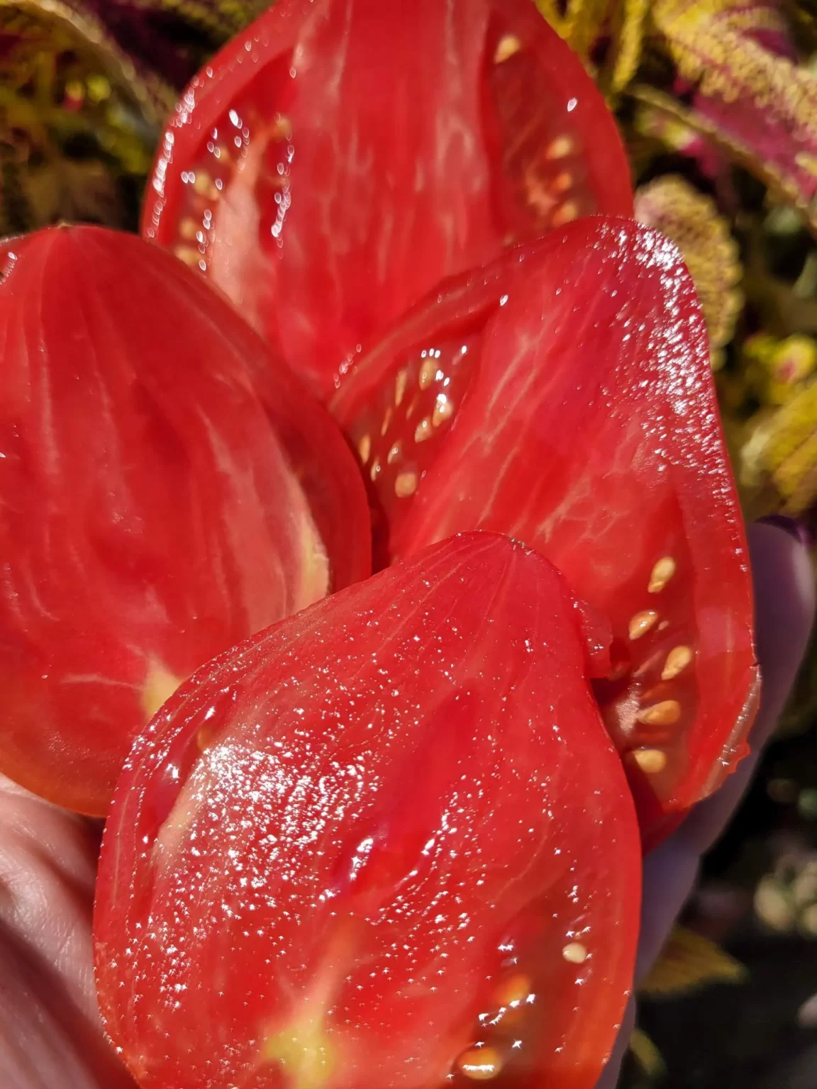 Мякоть обладает исключительной для сердцавидных томатов плотностью и мясистостью. На изломе она не водянистая, а сахаристая, что видно по характерным крупинкам. Внутри плод разделен на несколько семенных камер, но их количество невелико, а сами камеры заполнены в основном мякотью, а не жидкостью и семенами.