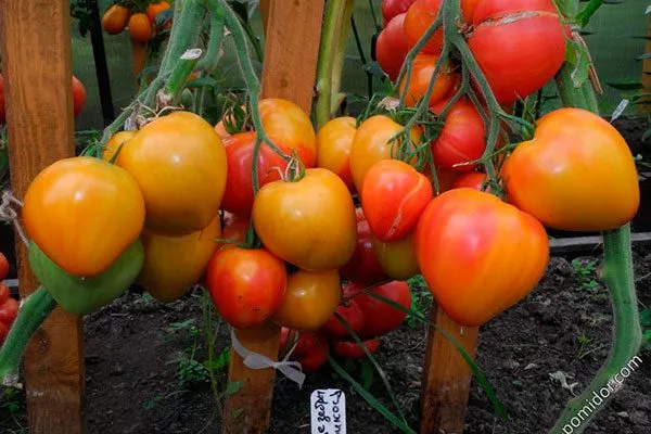 Спелые оранжево-малиновые «сердечки» на кустах привлекают внимание яркостью и аппетитным видом. Этот сорт обладает рядом замечательных качеств: