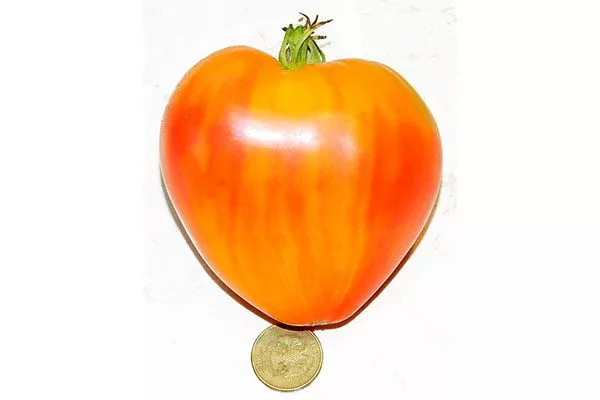 Сорт Сердце абрикосовой зебры привлекает уникальными оранжево-малиновыми помидорами в форме сердца. Они яркие и у них насыщенный вкус. Высокорослое растение демонстрирует отличную урожайность и устойчивость к заболеваниям. Овощи универсальны – их используют для свежих салатов и переработки.
