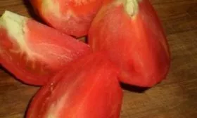 Форма и структура. Плоды имеют классическую сердцевидную форму, часто с четко выраженным острым «носиком» у основания. Мякоть очень плотная и мясистая (т.н. биф-томат), с числом семенных камер более шести. Благодаря высокому содержанию сухих веществ и небольшому количеству семян, плоды не водянистые.