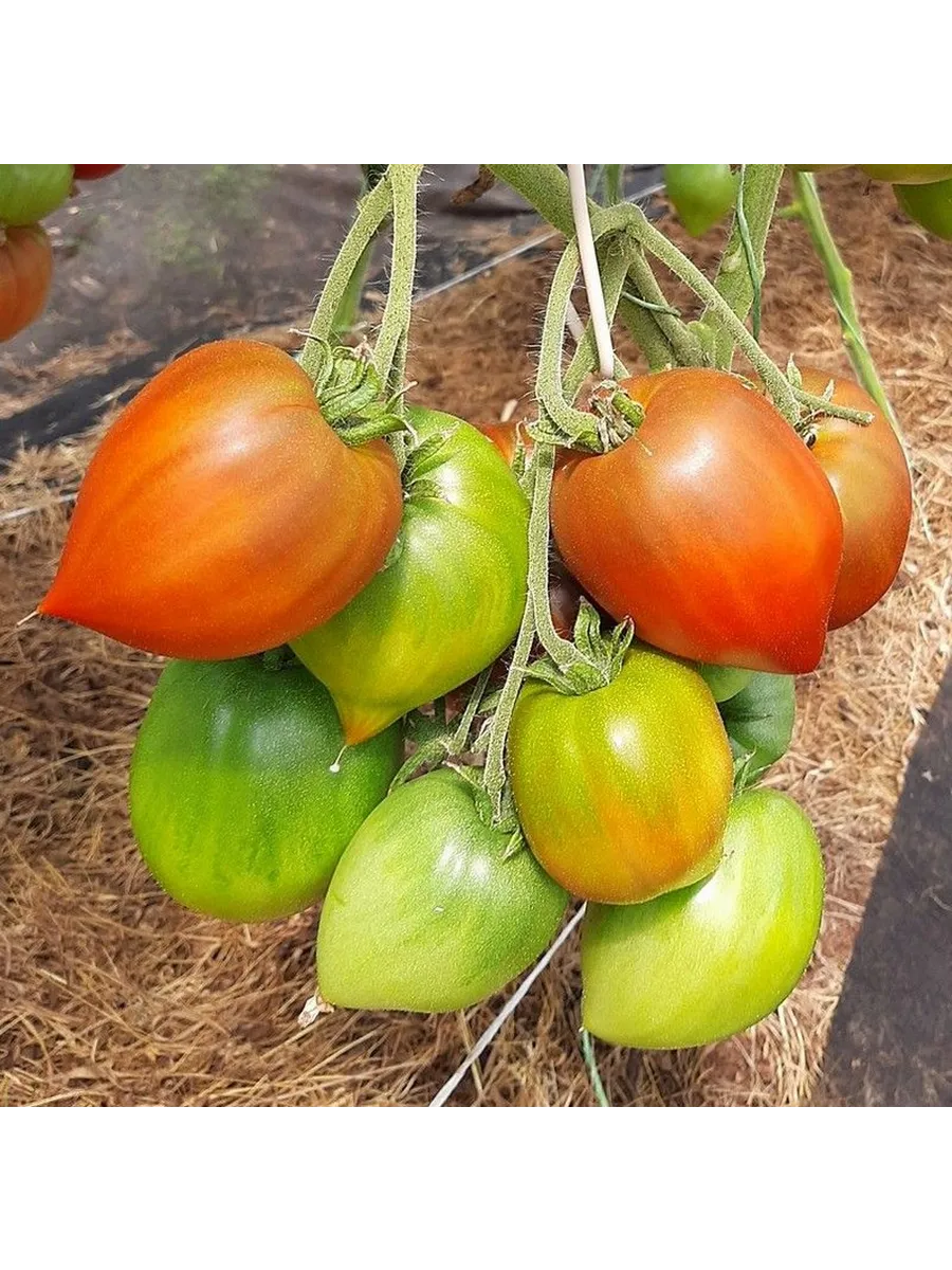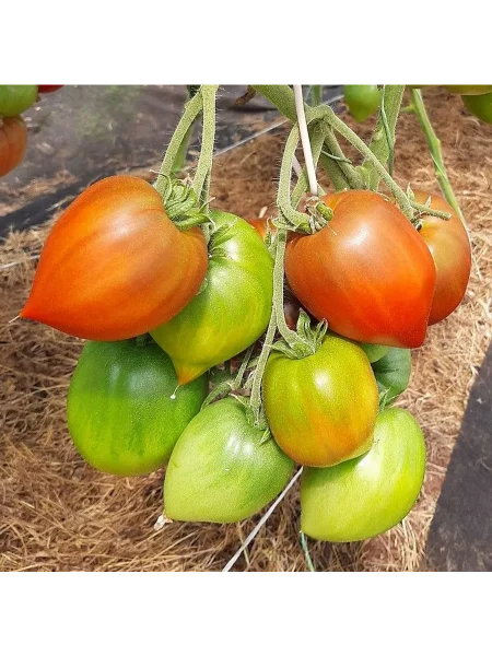 - Из-за крупноплодности и сердцевидной формы плоды в кистях бывают тяжелыми. Каждую кисть с наливающимися томатами необходимо дополнительно подвязывать к опоре мягкой лентой, чтобы избежать обламывания.