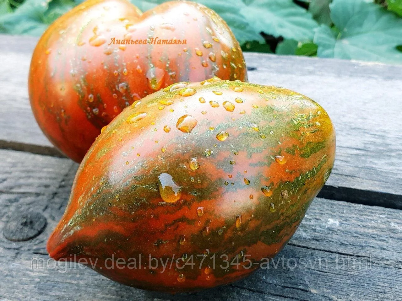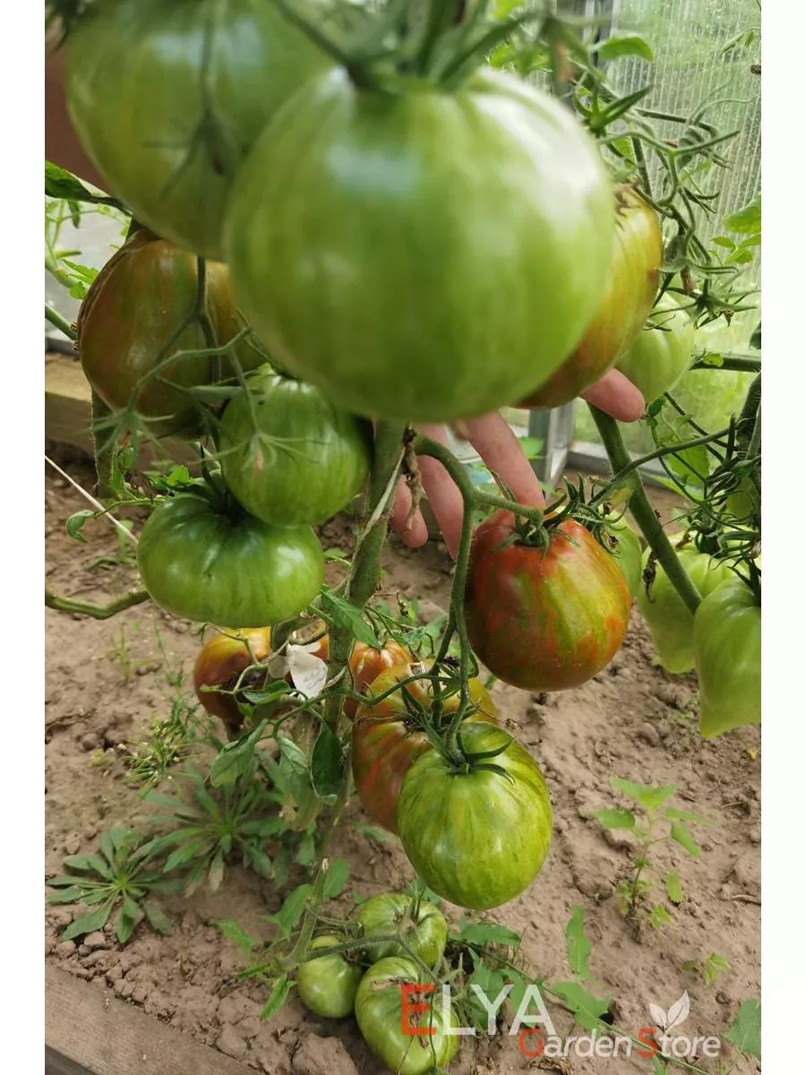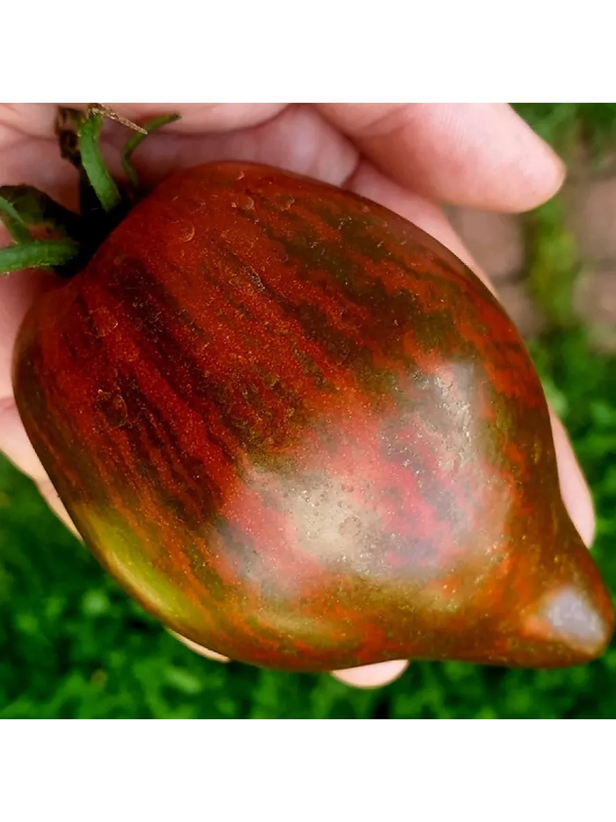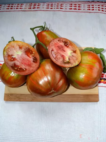 Главная отличительная черта — сложная, многослойная окраска, которая меняется по мере созревания. Основной фон зрелого томата — теплый коричнево-оранжевый, иногда описываемый как кирпичный. По этому фону проходят фигурные продольные полосы насыщенного зеленого цвета.