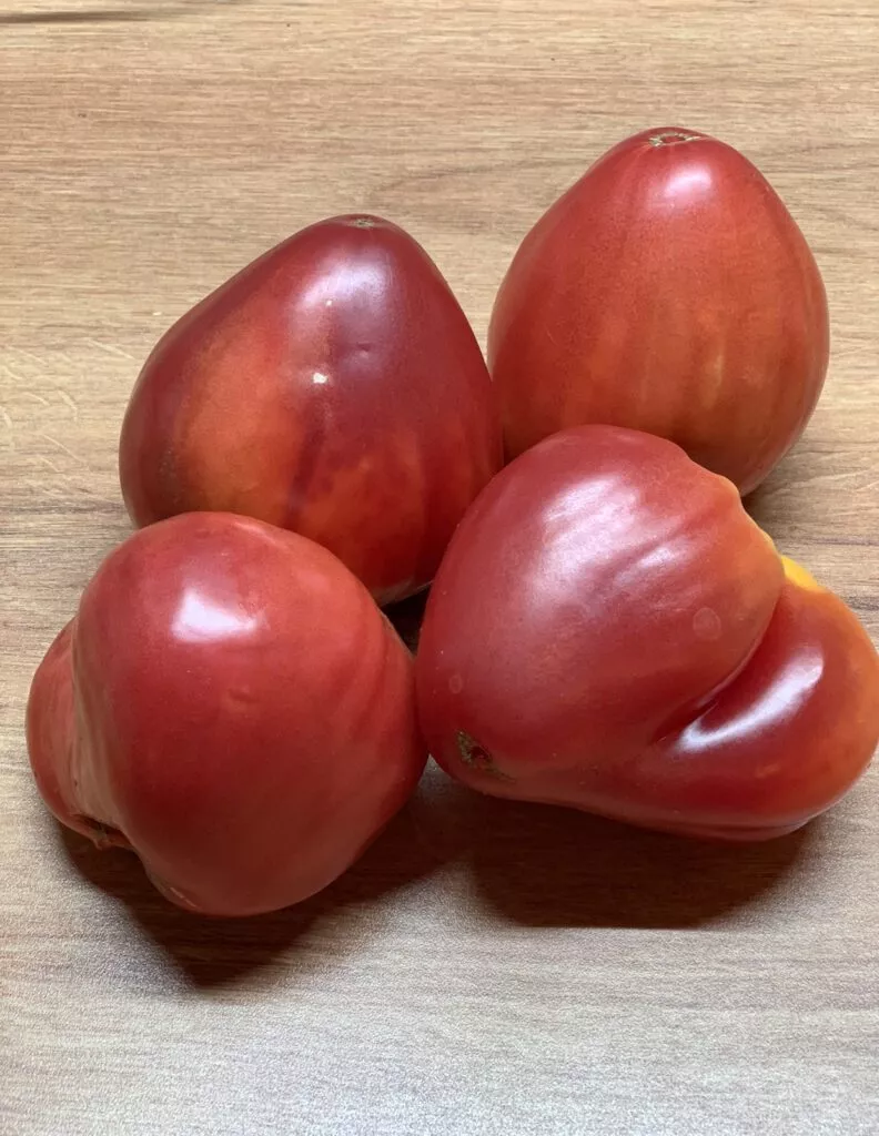 | Форма и цвет плода | Сердцевидная, слаборебристая, розовый | Классическая форма «биф-томата» с многокамерной, мясистой мякотью. Розовый цвет кожицы и мякоти указывает на высокое содержание сахаров и антиоксиданта ликопина, но такую кожицу легче повредить при транспортировке. |