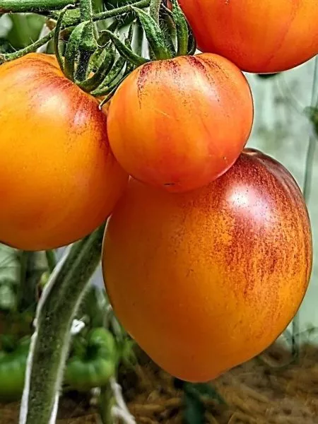 Плоды имеют узнаваемую сердцевидную форму с заостренным кончиком — так называемый тип «сливка с носиком». Однако главная отличительная черта — их сложная, меняющаяся окраска. В стадии технической спелости томаты зеленые с темно-зеленым пятном у плодоножки.