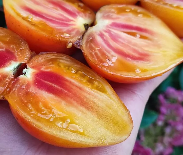 Уникальный вкус напрямую обусловлен биохимическим составом, который виден невооруженным глазом по окраске плода. Оранжево-малиновый цвет мякоти сигнализирует о высоком содержании ликопина и бета-каротина — пигментов, обладающих антиоксидантной активностью.