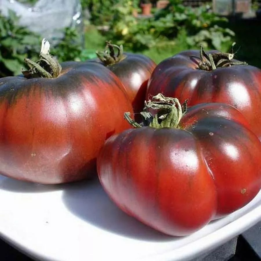 Плоды имеют классическую плоскоокруглую форму, что характерно для многих биф-томатов (крупноплодных сортов). Их главная отличительная черта — уникальный окрас. В фазе технической спелости у основания заметно темно-зеленое пятно, которое по мере созревания исчезает, уступая место равномерному красно-коричневому цвету.