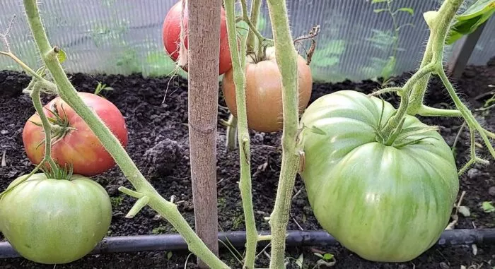 Мощный стебель и развитая корневая система позволяют кусту выдерживать вес крупных плодов, но надежная подвязка к опоре обязательна с самого начала. Без этого стебель может сломаться под нагрузкой, особенно в период созревания.