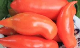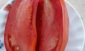 Истинная гордость сорта — его плоды. Они имеют необычную для крупноплодных томатов форму: не округлую или плоскоокруглую, а удлиненно-цилиндрическую, часто с выраженным носиком. Средняя масса плода составляет 200-300 граммов.