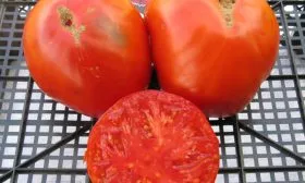 Плоды имеют характерную плоскоокруглую форму, часто с заметной ребристостью у плодоножки. Именно такая форма и плотная, но эластичная кожица способствуют устойчивости к растрескиванию, что особенно важно для крупноплодных томатов при неравномерном поливе.