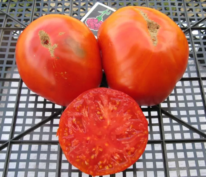 Плоды имеют характерную плоскоокруглую форму, часто с заметной ребристостью у плодоножки. Именно такая форма и плотная, но эластичная кожица способствуют устойчивости к растрескиванию, что особенно важно для крупноплодных томатов при неравномерном поливе.