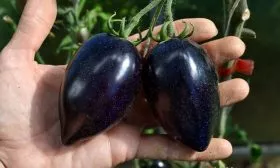 По мере полного созревания основная часть томата приобретает теплый оранжево-красный цвет, в то время как антоциановые «плечи» могут сохраняться. В итоге получается эффектный двухцветный плод. Интенсивность синей окраски напрямую зависит от количества получаемого ультрафиолета: в теплице или в пасмурное лето она может быть слабее, а на солнечном открытом месте — максимально насыщенной.