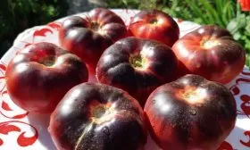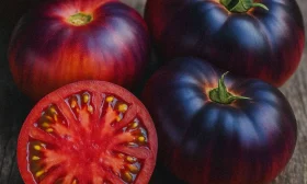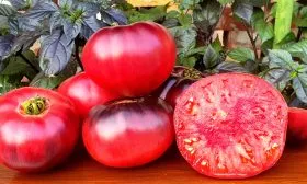Плоскоокруглая форма и плотная кожица делают томаты удобными для нарезки. Их уникальная эстетика — контраст розово-красной основы с темно-фиолетовыми, почти чернильными плечиками — превращает любое блюдо в кулинарный шедевр.