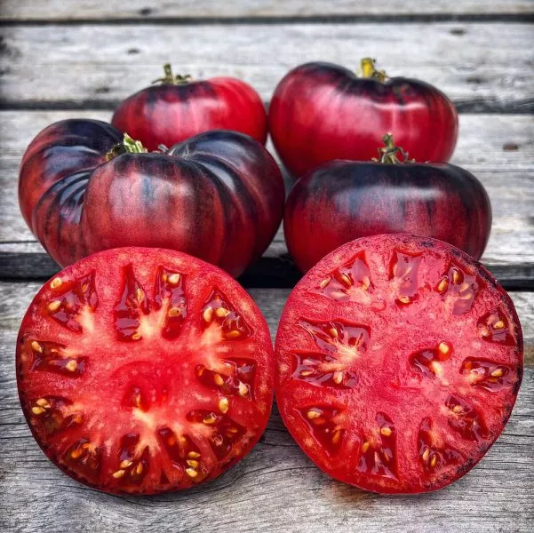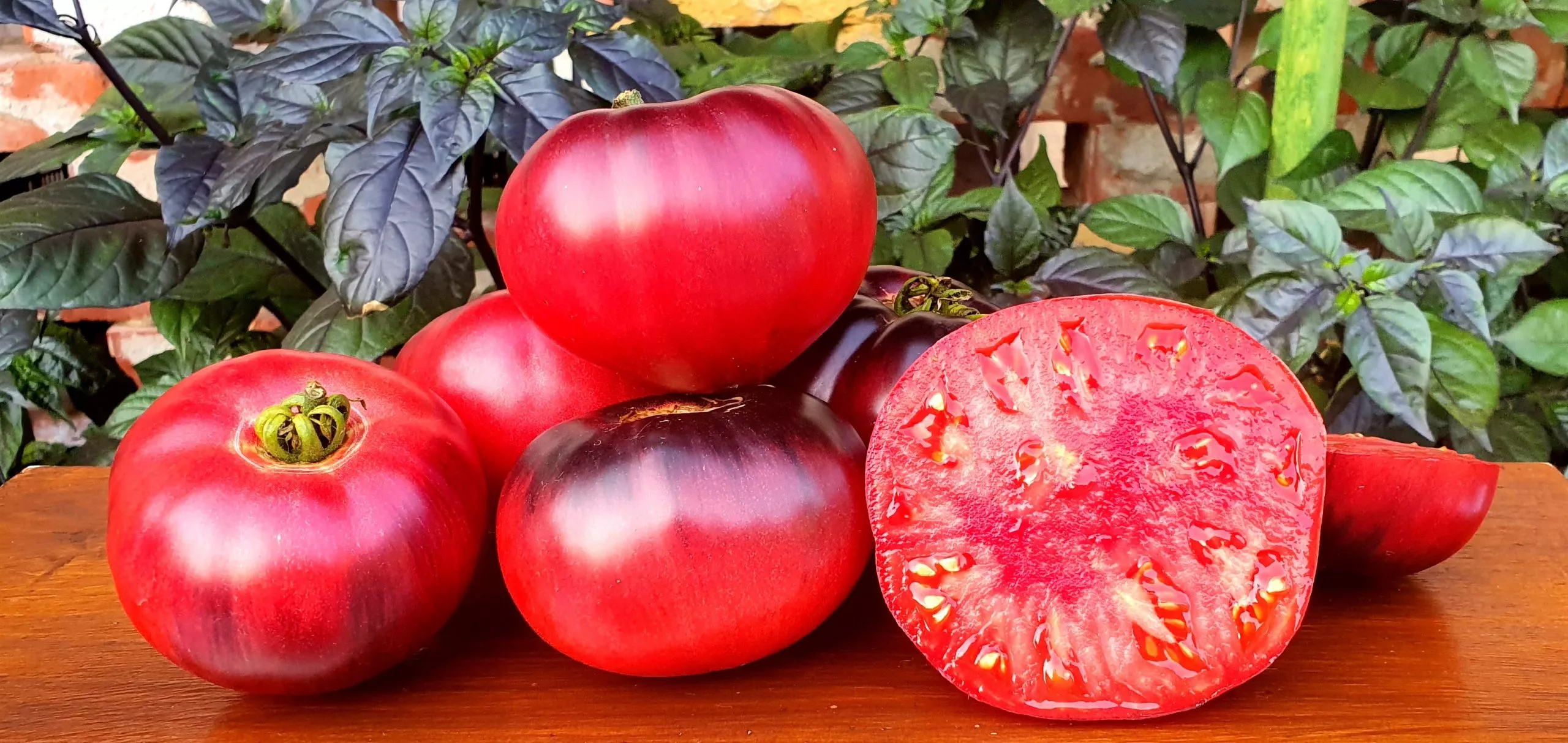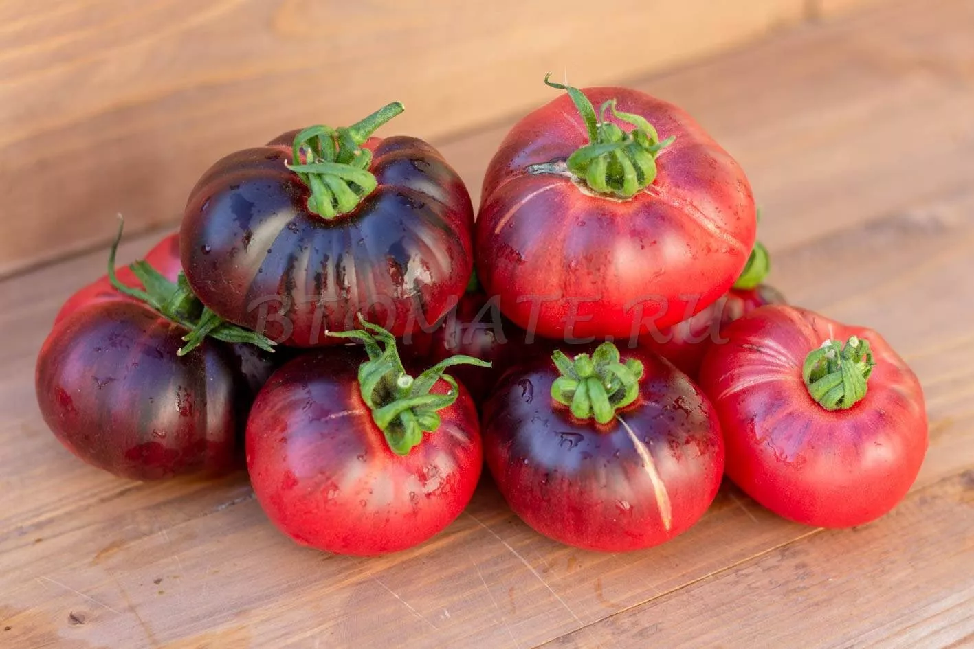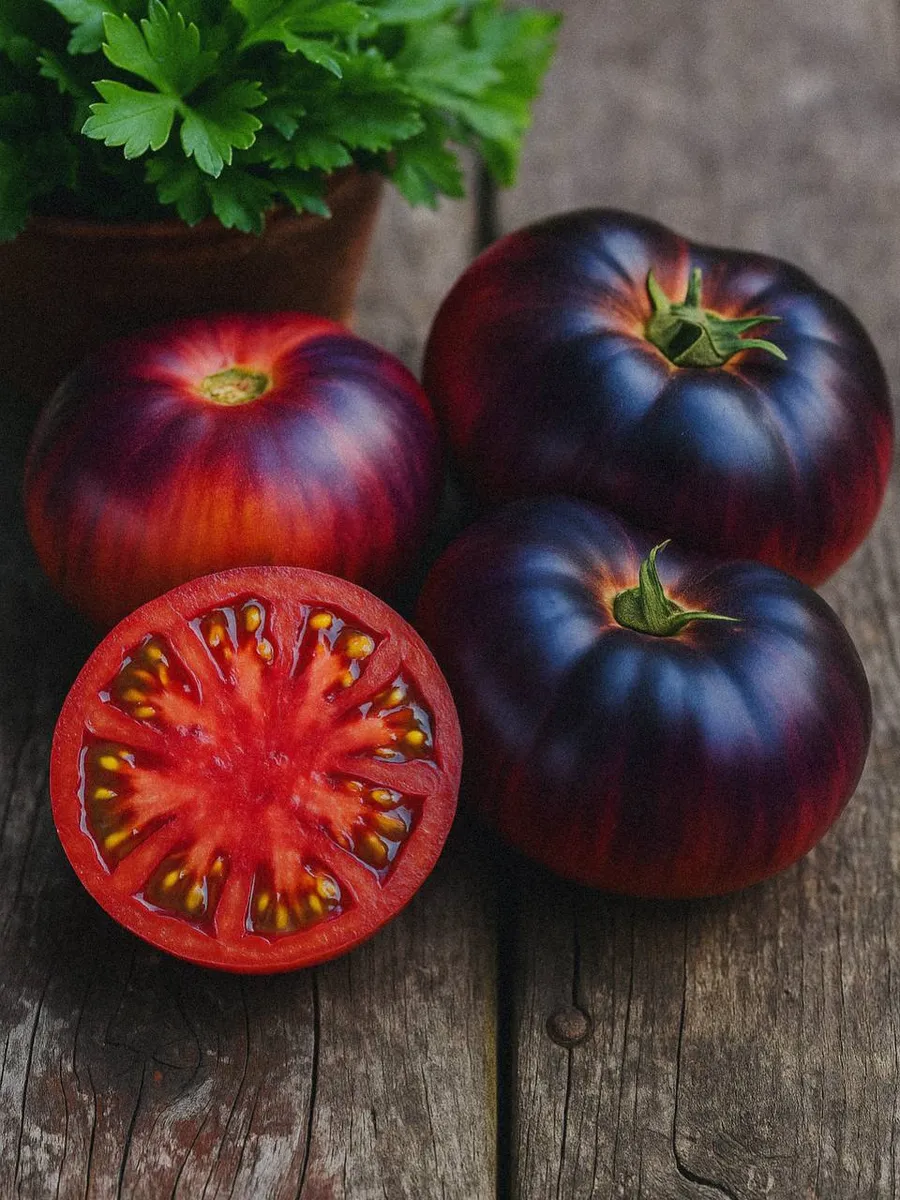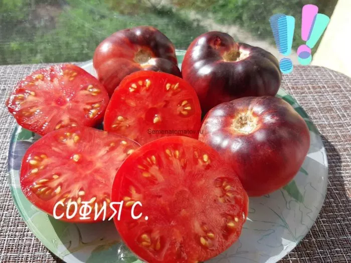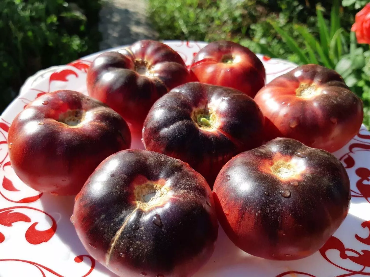 Плоскоокруглая форма и плотная кожица делают томаты удобными для нарезки. Их уникальная эстетика — контраст розово-красной основы с темно-фиолетовыми, почти чернильными плечиками — превращает любое блюдо в кулинарный шедевр.