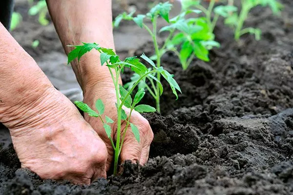 Саженцы аккуратно извлекают из емкостей, переносят их в лунки, заглубляя до первых настоящих листочков. Лунку засыпают почвой, аккуратно её уплотняют. Если рассада переросла, саженцы размешают горизонтально, при этом лунки приходится делать длинными, как небольшие траншеи. После посадки растения поливают водой с добавлением Фитоспорина.