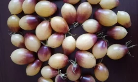 Плоды собраны в сложные, разветвленные кисти, которые несут по 10-15 и более завязей. Такая многоплодность обеспечивает высокую общую урожайность с куста. Масса каждого томата небольшая, в пределах 15-25 граммов. Компактный размер и плотная кожица делают их исключительно удобными для цельноплодного консервирования, маринования и особенно для вяления или сушки, где важна форма и мясистость.