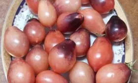 Плоды являются визитной карточкой сорта, выделяясь необычной и яркой внешностью. Их форма овально-сливовидная, с четко выраженным заостренным «носиком» у основания.