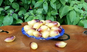 - Цельноплодное консервирование. Прочная кожица надежно защищает от растрескивания в горячем маринаде, а небольшой вес (15-25 г) гарантирует равномерный прогрев. Желтые плоды с фиолетовыми плечиками создают в банке необычный и привлекательный декоративный эффект.