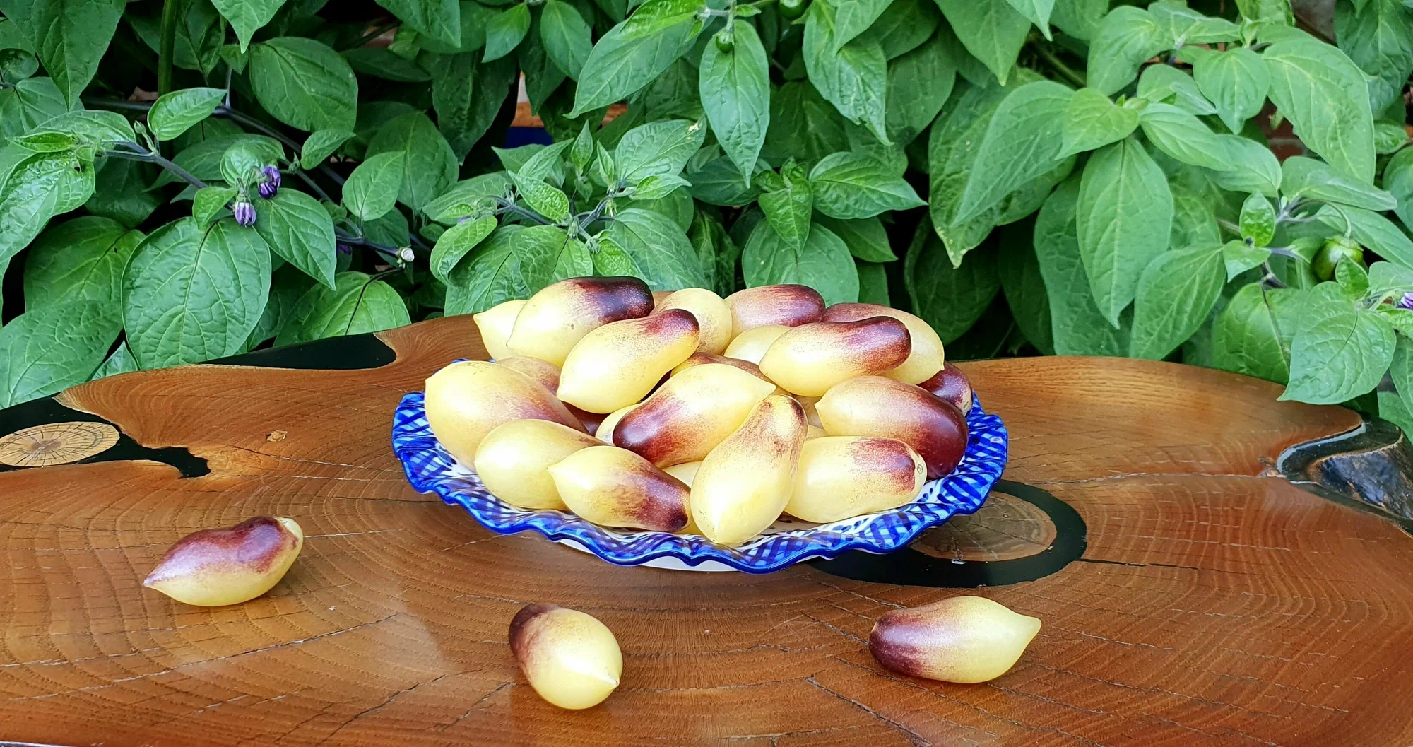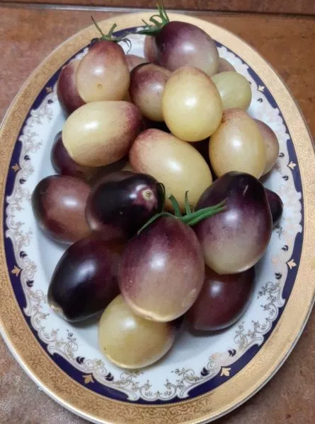 Внешний вид зрелой кисти, усыпанной гроздьями желтых плодов с фиолетовыми «шапочками», обладает высокой декоративной ценностью и может служить украшением как теплицы, так и огорода.