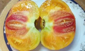 Ребраность умеренная. Кожица тонкая, глянцевая, но достаточно плотная, чтобы удерживать сочную мякоть, что важно для предотвращения растрескивания. На разрезе мякоть сахаристая, мясистая, почти без пустот, насыщенного оранжево-жёлтого цвета. Семенных камер немного, семян среднее количество.