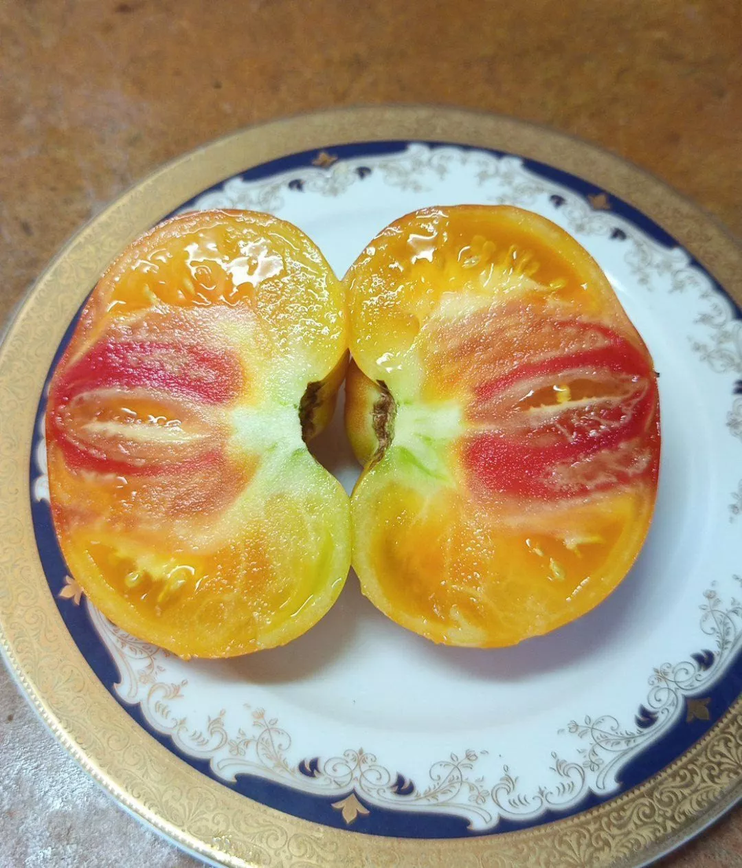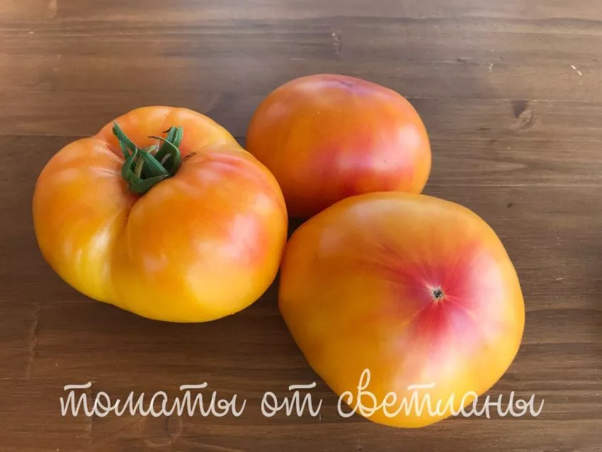 Внешность этого томата — его главная «визитная карточка». Сорт невозможно спутать с другими благодаря уникальной окраске, которая полностью проявляется только при полном биологическом созревании на кусте. Основной фон зрелого плода — насыщенный солнечный жёлто-оранжевый, напоминающий абрикос или спелый манго.