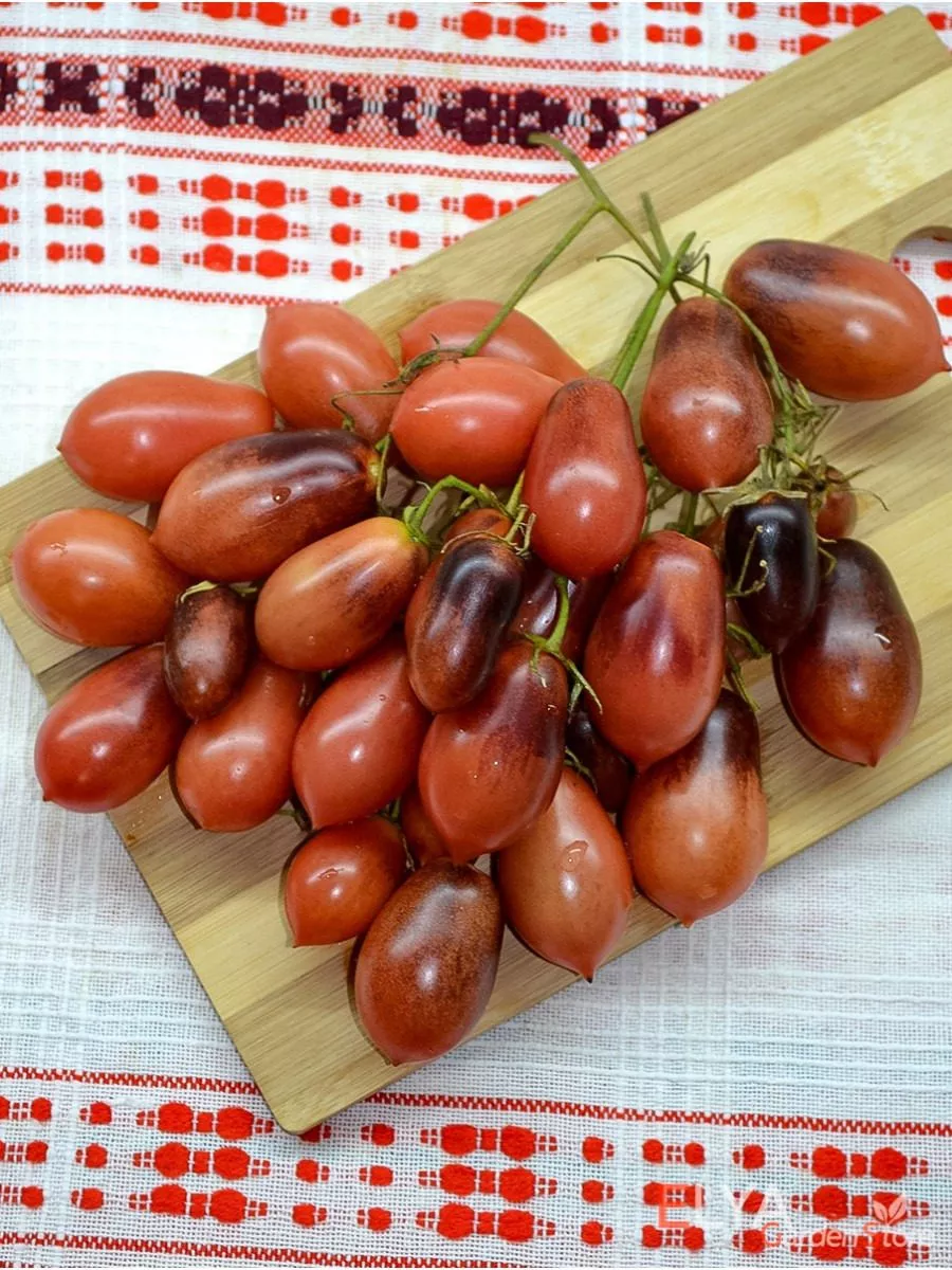 Плоды имеют овальную или грушевидную форму с гладкой, плотной кожицей. Они формируются в длинные, разветвленные кисти, характерные для многих индетерминантных сортов. Такое строение грозди не только повышает декоративность куста, но и требует внимания при подвязке, чтобы тяжелеющие ветви не обломились.