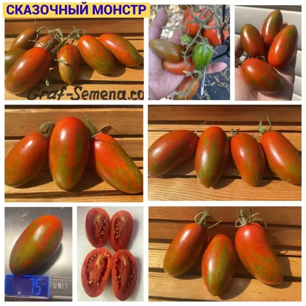 Название «Сказочный монстр» точно отражает его внешнюю уникальность. Нестандартная для томатов коричнево-зеленая полосатая окраска зрелых плодов и их овальная форма с «носиком» создают сказочный, почти фантастический образ. При этом сорт демонстрирует хорошую адаптацию и урожайность, что доказывает: декоративность в современной селекции успешно сочетается с практической функциональностью.