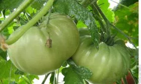 Плоды имеют характерную плоскоокруглую, слегка приплюснутую форму. Ребристость слабо выражена и обычно проявляется только в области плодоножки. В технической спелости томаты зеленые с заметным темно-зеленым пятном у основания, которое полностью исчезает при созревании.