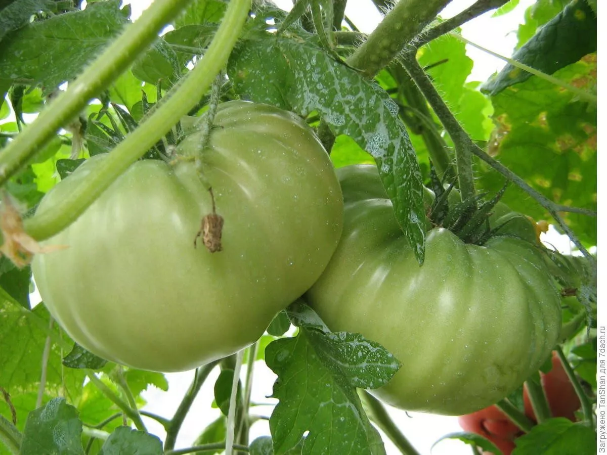 Плоды имеют характерную плоскоокруглую, слегка приплюснутую форму. Ребристость слабо выражена и обычно проявляется только в области плодоножки. В технической спелости томаты зеленые с заметным темно-зеленым пятном у основания, которое полностью исчезает при созревании.