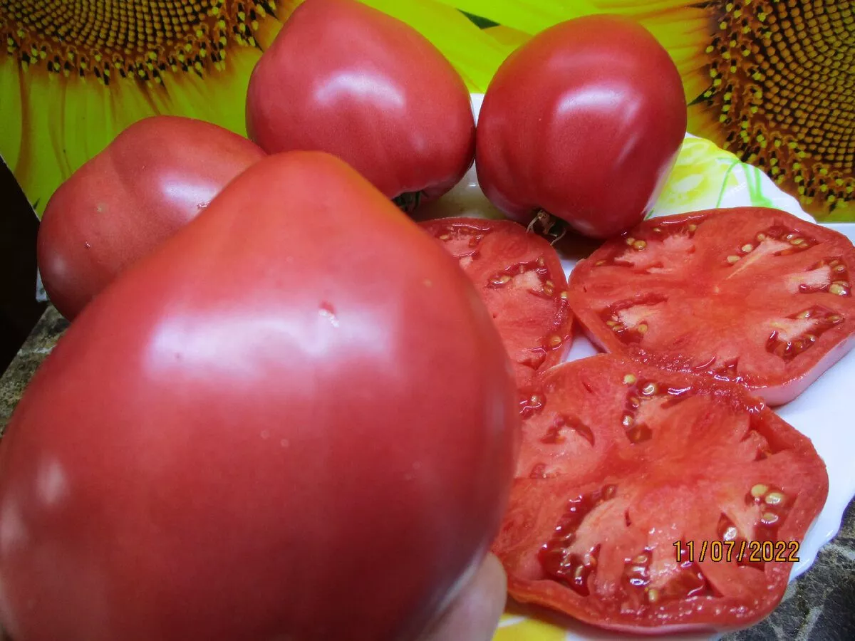 Окраска в стадии полной зрелости — насыщенно-малиновая или розово-малиновая. Мякоть многокамерная, мясистая, с высоким содержанием сухих веществ и сахаров. Кожица плотная, но не грубая, что предохраняет крупные плоды от растрескивания при перепадах влажности.