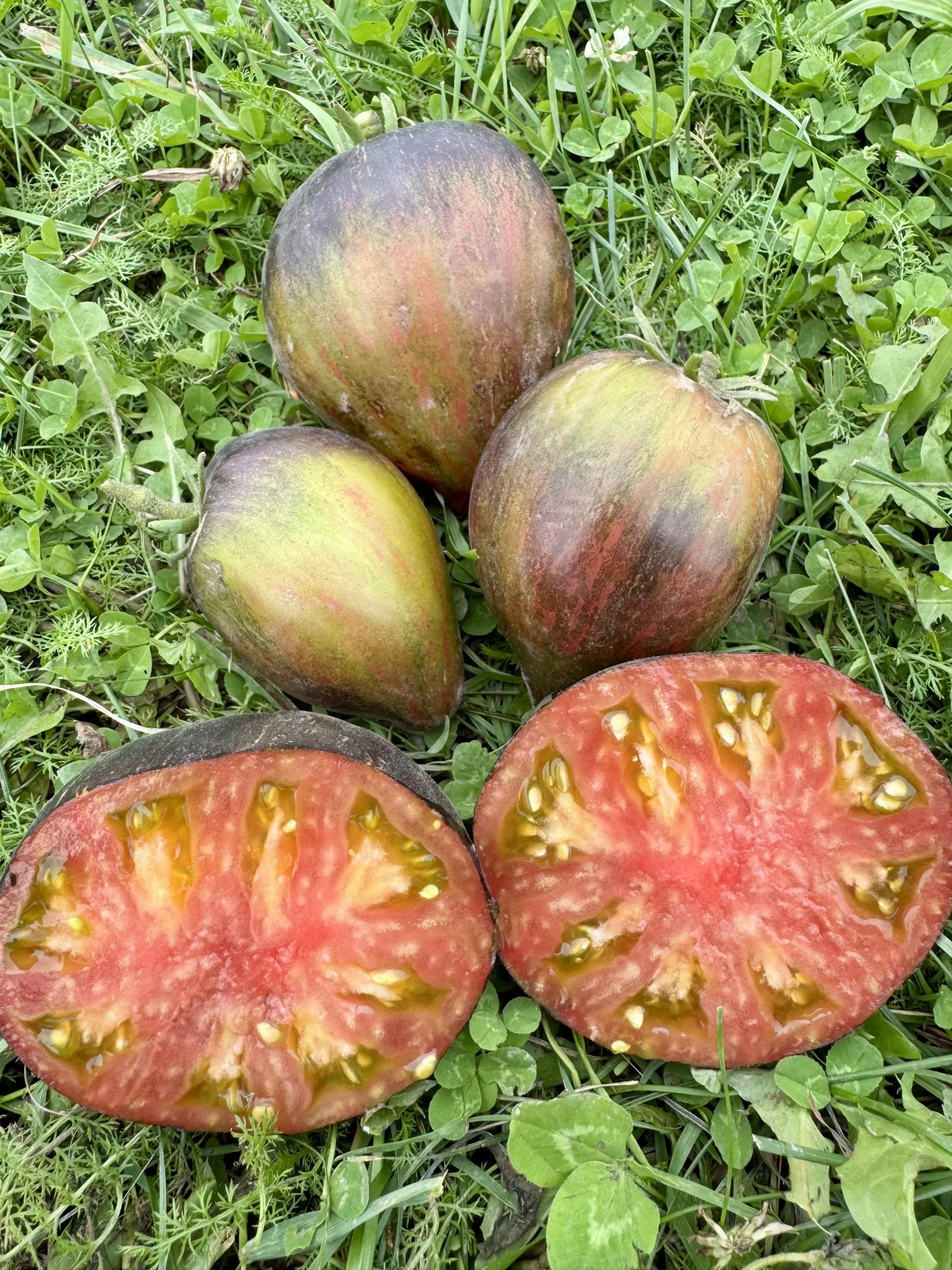 Этот томат невозможно спутать с другими сортами. Его визитная карточка — сложная, многоцветная окраска, которая проходит несколько стадий трансформации по мере созревания. В технической спелости, когда плоды еще зеленые, на их плечиках появляются темно-фиолетовые, почти черные участки с характерным антоциановым отливом.