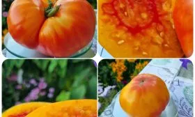 Сорт выделяется на грядке или в теплице своей декоративностью. Плоды имеют плоскоокруглую форму и нестандартную окраску: основной оранжевый фон сочетается с красными румянами, что делает их внешний вид очень привлекательным.