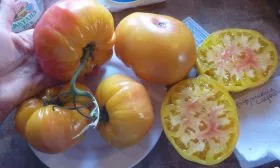 - Томатный сок и паста. Мясистая структура и малое количество семян обеспечивают высокий выход густого, насыщенного продукта. Сок получается сладким, имеет красивый оранжево-красный оттенок и не требует добавления сахара. Паста и соусы увариваются быстрее благодаря высокому содержанию сухих веществ.