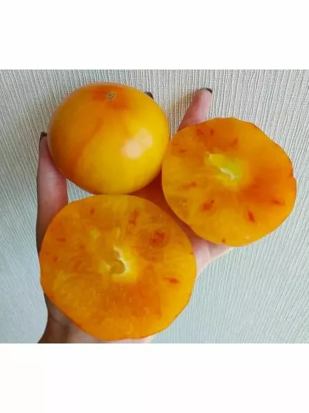 Сорт выделяется на грядке или в теплице своей декоративностью. Плоды имеют плоскоокруглую форму и нестандартную окраску: основной оранжевый фон сочетается с красными румянами, что делает их внешний вид очень привлекательным.
