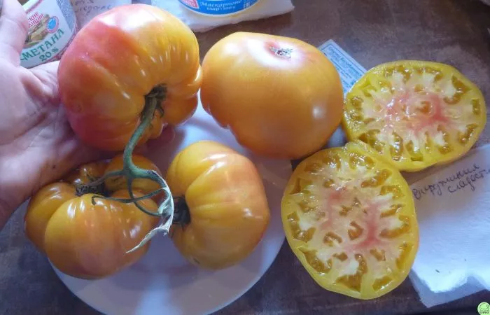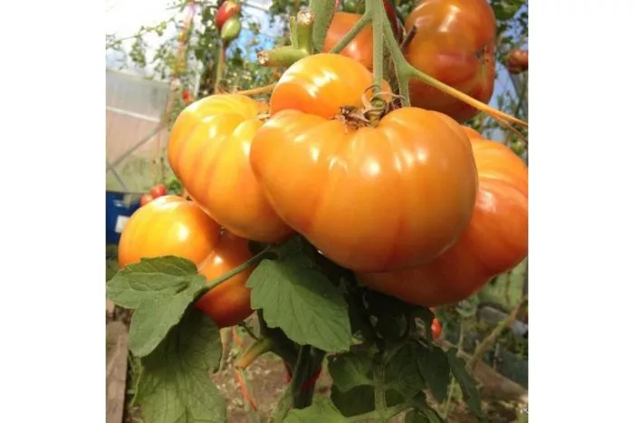 Плоды — ключевая отличительная черта сорта. Их плоскоокруглая форма часто переходит в выраженно ребристую, особенно у плодоножки, что придает им узнаваемый «помятый» вид. Ребристость обычно более заметна у самых крупных экземпляров, формирующихся на нижних кистях.
